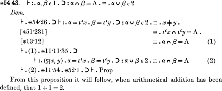 Kyseinen lause on sivulla 362, ja koko kirjassa on yli 700 sivua, mutta Lauseeseen \(110\!\cdot\! 643\), jossa \(1+1=2\) sitten lopulta todistetaan, päästään kuitenkin vasta kirjasarjan toisessa osassa, sivulla 83. Tarkkaan ottaen merkkiä \(+\) ei käytetä, vaan jostain syystä on valittu muoto \(1+_\circ 1=2\). Kirjoittajat huomauttavat lauseen todistuksen jälkeen: