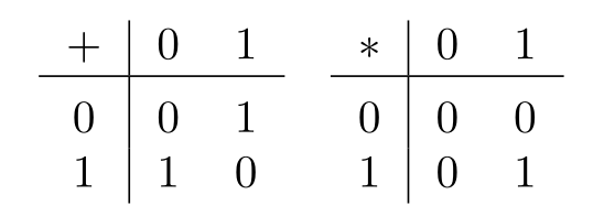 Olkoon \(\mathbb{Z}_2=\{0,1\}\) ja määritellään tässä joukossa yhteen- ja kertolasku seuraavasti: