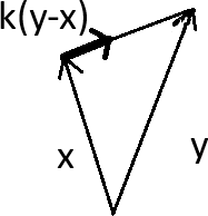 Olkoon sitten \(x,y \in \mathbb{R}^3\). Haluamme piirtää janan pisteestä \(x\) pisteeseen \(y\). Tämä tehdään niin, että aloitetaan pisteestä \(x\) ja piirretään janaa vektorin \(y-x\) suuntaisesti. Jana on siis \(\{ x+k(y-x) \mid 0 \le k \le 1 \}\). Toisaalta lauseke \(x+k(y-x)=(1-k)x + ky\). Tämä tarkoittaa sitä, että janan pisteet ovat täsmälleen painotetut keskiarvot pisteistä \(x\) ja \(y\). (Katso kuva 9.)