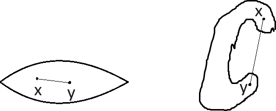 Olkoon \(A \subset \mathbb{R}^3\). Sanomme, että \(A\) on konveksi, jos kaikilla \(x,y \in A\) pätee, että joukko \(A\) sisältää janan pisteestä \(x\) pisteeseen \(y\). (Katso kuva 6.)