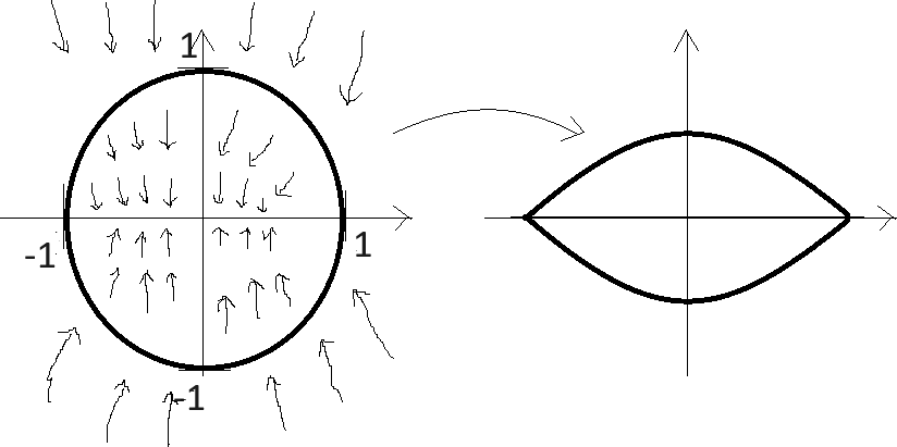 Olkoon \(x\) piste vasemmanpuoleisen kuvan tasolla ja \(f(x)\) se oikeanpuoleisen kuvan tason piste, jonne \(x\) venytettäessä menee. Näin saamme bijektion \(f \colon \mathbb{R}^2 \rightarrow \mathbb{R}^2\).