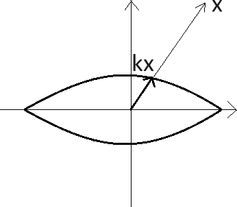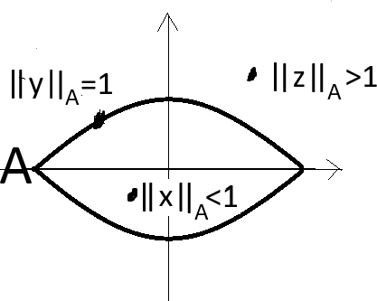 Määrittelemme joukon \(A\) avulla normin \(\lVert \cdot \rVert_A\) seuraavasti: Olkoon \(x \in \mathbb{R}^3\). Olkoon \(k \in \mathbb{R}, k > 0\) sellainen, että \(kx\) sijaitsee joukon \(A\) reunalla. (Katso kuva 8.) Tällainen \(k\) on aina olemassa, kun \(x \ne \bar 0\), koska \(\bar 0\) sijaitsee kappaleen \(A\) sisällä ja \(A\) on rehellinen fysikaalinen kappale. Koska \(A\) on konveksi, \(k\) on myös yksikäsitteisesti määrätty. Nyt määritellään \(\lVert x \rVert_A = 1/k\). Lisäksi määritellään \(\lVert \bar 0 \rVert_A=0\).