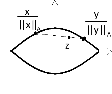 Olkoon \(x,y \in \mathbb{R}^3\). Määritellään \(z\) seuraavasti: \[\begin{aligned} z&=\frac{x+y}{\lVert x \rVert_A + \lVert y \rVert_A}\\ &= \frac{\lVert x \rVert_A}{\lVert x \rVert_A + \lVert y \rVert_A} \cdot \frac{x}{\lVert x \rVert_A} + \frac{\lVert y \rVert_A}{\lVert x \rVert_A + \lVert y \rVert_A} \cdot \frac{y}{\lVert y \rVert_A}. \end{aligned}\] Nyt \(\frac{x}{\lVert x \rVert_A}\) ja \(\frac{y}{\lVert y \rVert_A}\) ovat joukon \(A\) reunalla, ja \(z\) on painotettu keskiarvo näistä pisteistä. Piste \(z\) siis sijaitsee näitä pisteitä yhdistävällä janalla, ja koska \(A\) on konveksi, \(z\) sijaitsee siis joukossa \(A\). (Katso kuva 10.) Jos siis valitaan \(k\) niin, että \(kz\) on joukon \(A\) reunalla, \(k \ge 1\), ja siis \(\lVert z \rVert_A \le 1\).