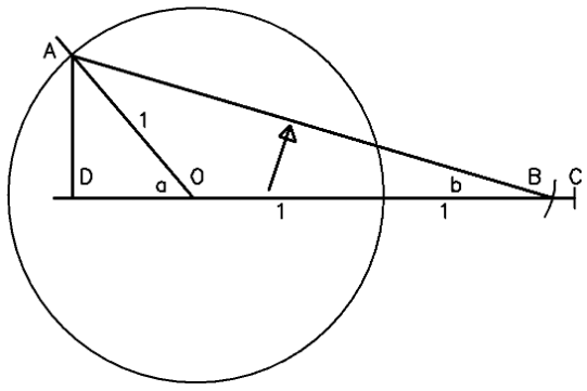 Kulman \(b\) arvojen laskemiseksi taulukkoa varten muodostetaan trigonometrinen lauseke. Kuvassa on suorakulmainen kolmio \(AOD\), jonka hypotenuusa on ympyrän säde. Merkitään sille pituudeksi luku 1. Tällöin se on myös kuvan yksikkömittajana, josta seuraa janoille pituudet: \(AD = 1 \times \sin a\), \(DO = 1 \times \cos a\), \(DC\) ja \(AB = 1 \times \cos a + 2\). Edellisen perusteella saadaan \(\sin b\):lle lauseke: \[\sin b = \frac{\sin a}{\cos a + 2},\] josta saadaan \[b = \arcsin \left( \frac{\sin a}{\cos a + 2} \right),\] jonka tuloksena: \(b \approx a/3\), kun \(a = 0..90^{\circ}\).