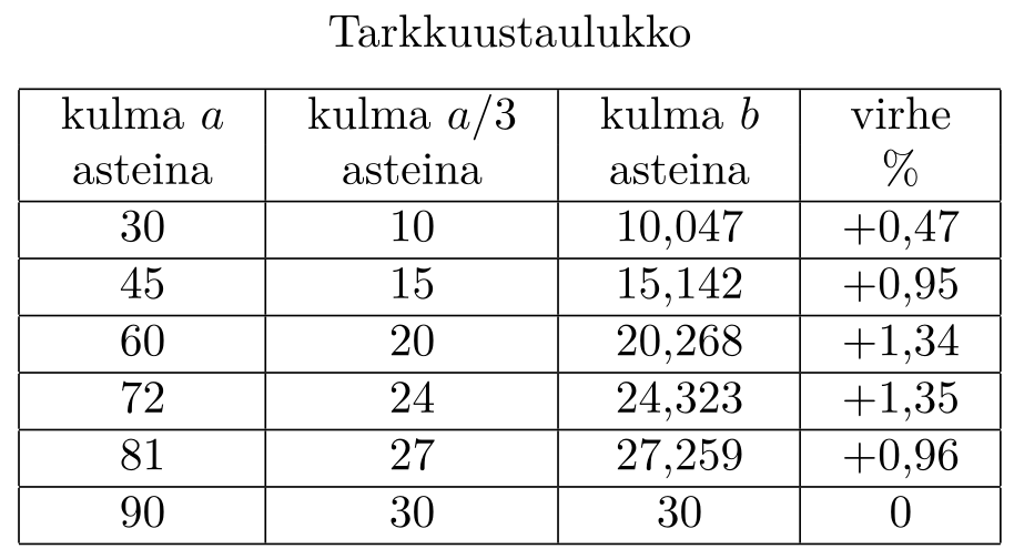 Tulos: Kulma \(b\) on kulman \(a\) kolmasosa varsin tarkasti. Virhe on \(< \frac{1}{3}^{\circ}\) ja \(a\):n ollessa \(90^{\circ}\) tulos on jopa täysin tarkka (katso taulukko).