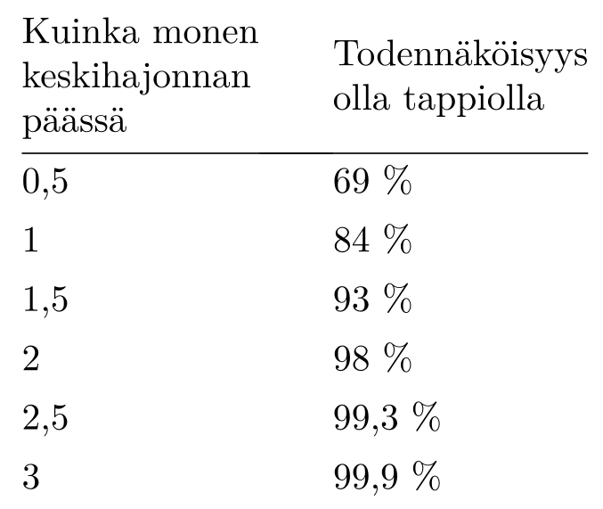 Jussin pelissä talon etu on noin 0,027 ja keskihajonta noin 5,8. Tämä tarkoittaa sitä, että kymmenentuhannen pelin sarjassa talon etu on noin \(270\) ja keskihajonta \(580\). Olemme siis taulukon rivin 0,5 keskihajontaa suuruusluokassa, todennäköisyys jäädä tappiolle on vain 69 %.