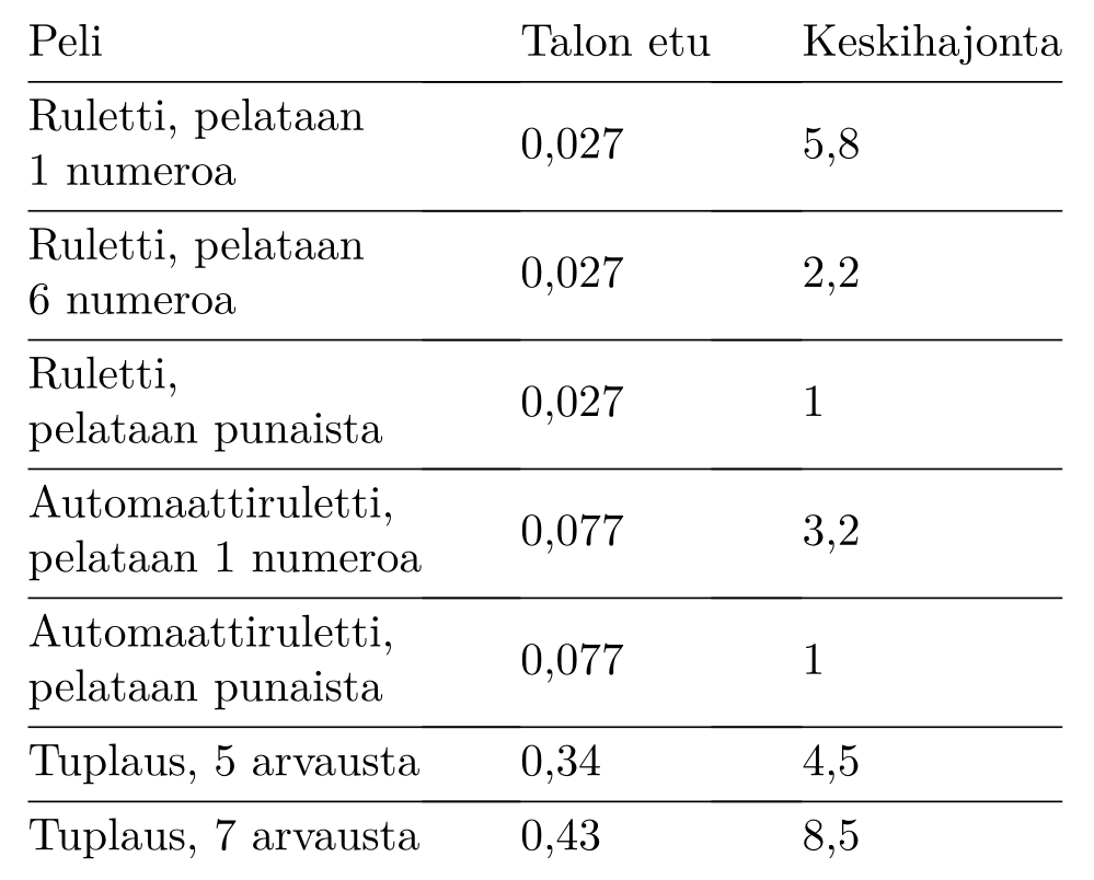 Alla on taulukko joidenkin helposti laskettavien pelien talon eduista ja keskihajonnoista. Kaikissa oletetaan euron panos. Olemme kiinnostuneet suuruusluokista, joten lukuja on pyöristelty.