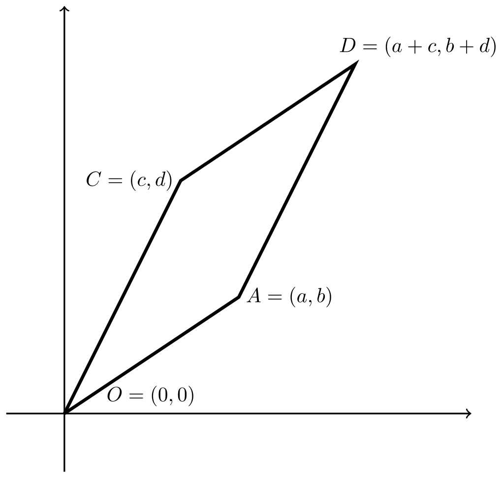 Determinantilla on mukava geometrinen tulkinta: Jos piirretään suunnikas, jonka kärjet ovat pisteissä \((a,b)\) ja \((c,d)\), niin tämän suunnikkaan ala on