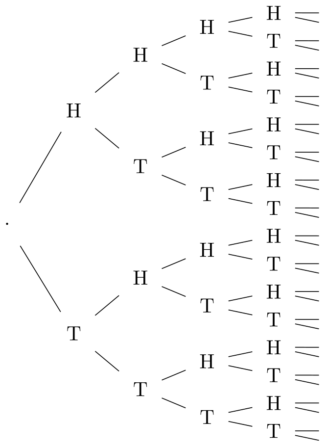 No, Python-ohjelma kirjoitettiin, mutta siinä vaikutti olevan jokin bugi, sillä onnetar suosi säännöllisesti Bobia, jolla voiton todennäköisyys oli aina kolmisen prosenttiyksikköä suurempi kuin Alicella. Bugia ei sitkeistä etsinnöistä huolimatta löydetty. Heräsi epäilys, että vika on jossain muualla, esimerkiksi aritmeettis-loogisessa yksikössä otsaluun takana. Hoksattiin tutkia miten käy, jos heittosarja on paljon lyhyempi, vaikkapa neljä heittoa? Oheisesta puukaaviosta, jossa \({\rm H}\) tarkoittaa kruunaa (heads) ja \({\rm T}\) tarkoittaa klaavaa (tails), nähdään huolellisesti katsomalla, että neljän kolikonheiton tapauksessa kaikista mahdollisista 16 pelistä Alice voittaa neljä ja Bob kuusi. Jäljelle jäävät kuusi ovat tasapelejä. Python-ohjelma taisi olla kunnossa alun alkaenkin.