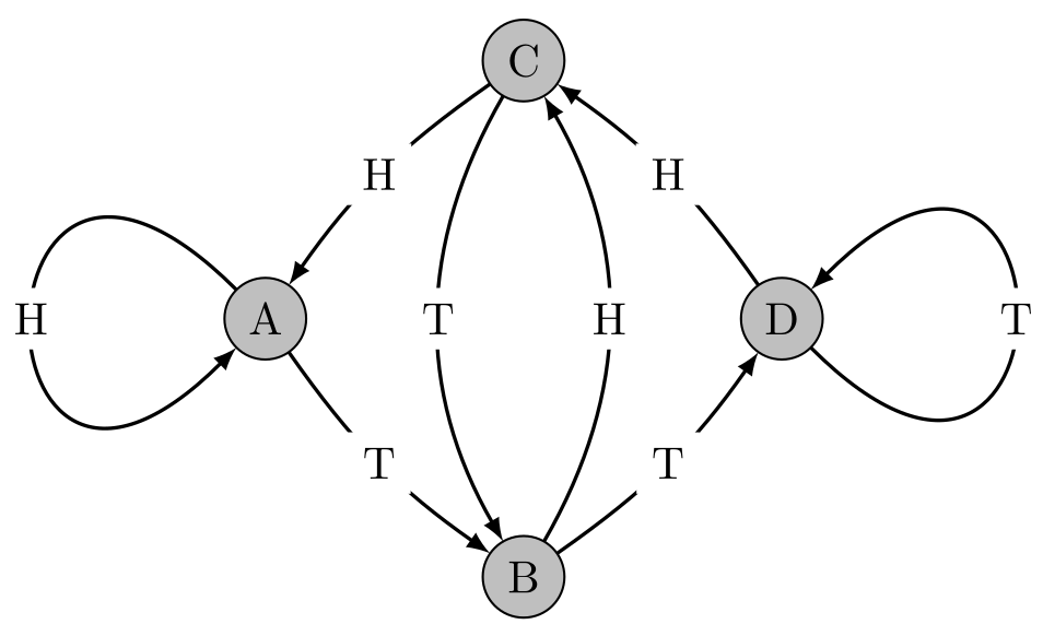 Kolikonheiton tulosjonoa mallinnetaan yhtä pitkällä kirjainten \({\rm H}\) ja \({\rm T}\) muodostamalla jonolla. Alice saa pisteen jokaisesta \({\rm H}{\rm H}\) -esiintymästä ja Bob jokaisesta \({\rm H}{\rm T}\) -esiintymästä. Esimerkiksi kirjainjono \({\rm H}{\rm T}{\rm T}{\rm H}{\rm H}{\rm T}{\rm H}\) vastaa erästä seitsemän kolikonheiton tulosjonoa. Siitä tulee Alicelle yksi piste ja Bobille kaksi. Täydellisyyden vuoksi otetaan mukaan myös pelaajat Cheryl, joka saa pisteen jokaisesta \({\rm T}{\rm H}\) -esiintymästä, ja Dustin, joka saa pisteen jokaisesta \({\rm T}{\rm T}\) -esiintymästä. Yleisyyttä tavoitellen sovitaan, että kolikkoa heitetään \(n\) kertaa. Tällöin puhutaan \(n\) -pelistä. Kaikkien mahdollisten \(n\)-pelien joukkoa kutsutaan \(n\)-peliavaruudeksi. Pelaajien nimet lyhennetään muotoon \({\rm A}\), \({\rm B}\), \({\rm C}\) ja \({\rm D}\). Toisesta heittokerrasta alkaen joku nelikosta saa pisteen jokaisella heittokerralla.