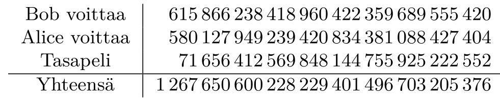 ja sai sitä kautta selville, miten monta \(2^{100}\):sta mahdollisesta pelistä päätyy Alicen tai Bobin voittoon tai tasapeliin: